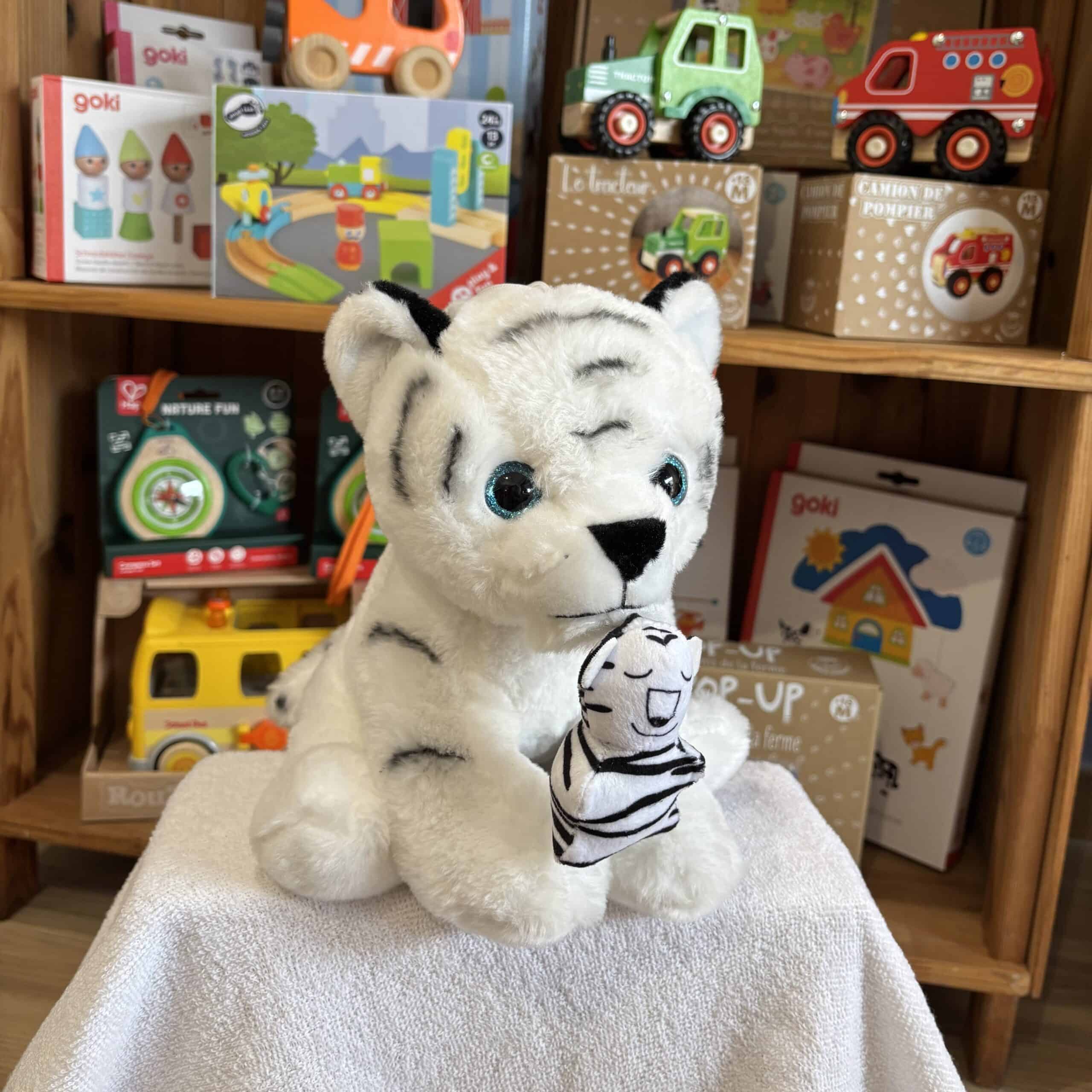 Cette peluche tigre blanc est également une excellente idée de cadeau. Elle convient aussi bien pour une naissance, un anniversaire ou une petite attention. Son originalité – avec le bébé tigre dans la bouche – la distingue des peluches classiques, tout en conservant un fort pouvoir émotionnel.