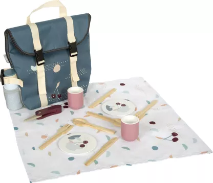 Le sac à dos pratique offre tout ce dont vous avez besoin pour un repas agréable en plein air : des assiettes, des tasses et des couverts pour deux personnes, ainsi qu’une bouteille thermos, un couteau pliant et une couverture de pique-nique en bois.